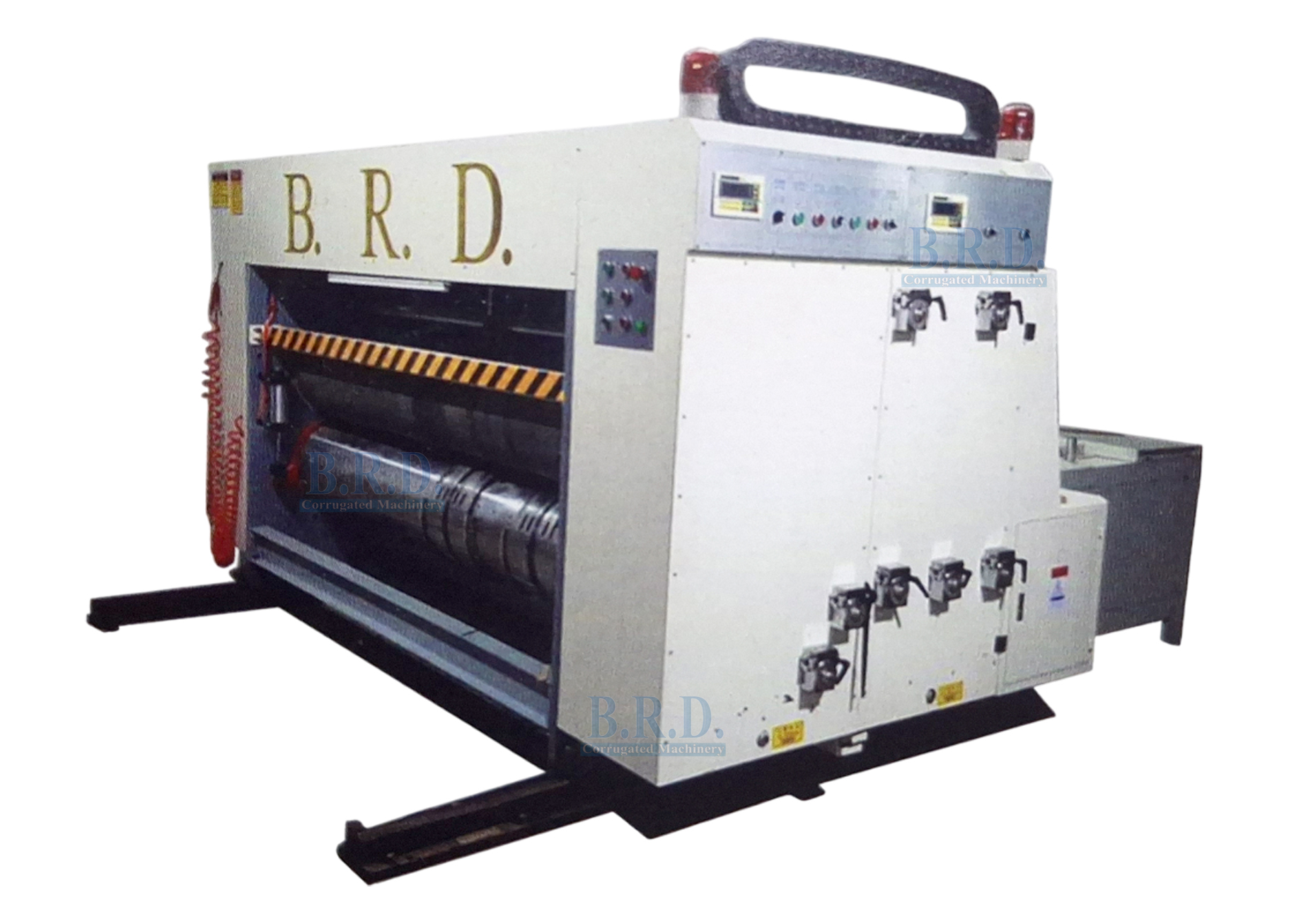 This Machine is used for Flexo Printing and Die Cutting of Sheets Simultaneously. It offers High Precision of Printing with easy operation. Opening and Closing is Controlled Electrically. Locking up and Elevating Plate is done by Pneumatic System. Printing Roller adopts 360° Phase Adjustment, Controllrd, Electrically even during running Machine. The Die Cutting Cylinder Adopts 360° Phase Adjustment, Controlled, Electrically for easy Die Setting. Grinding Attachement for Rubber Anvil Cover is Mounted on the Machine. Ring Slotter Attachement can be Adopted at an additional cost.